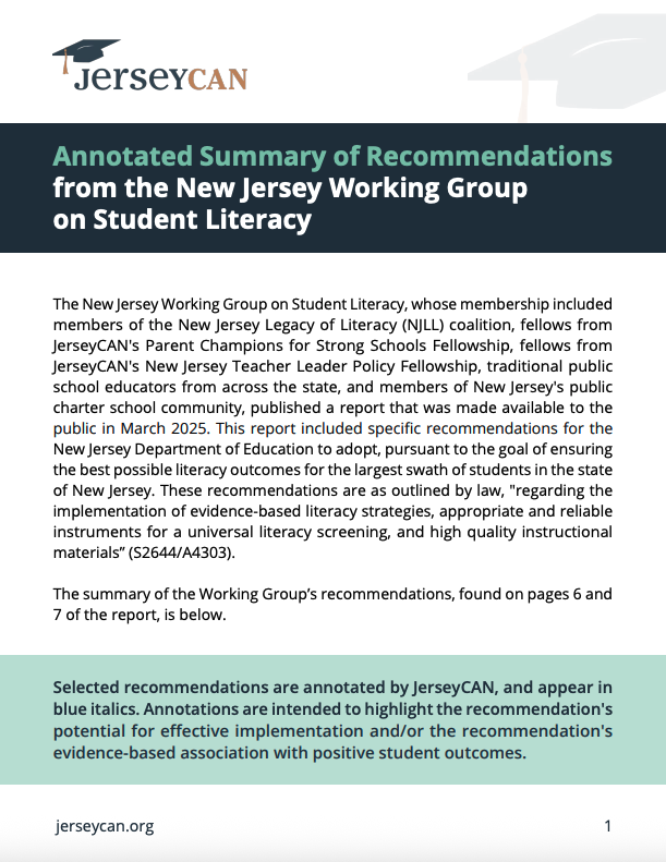 [New Jersey – April 2, 2025] JerseyCAN, the only statewide advocacy organization in New Jersey committed to ensuring access to high-quality public schools for every child regardless of zip code, cultural background, and socioeconomic status, released today an easy-to-understand white paper regarding the recommendations produced by the New Jersey Department of Education’s (NJDOE) Working Group on Student Literacy.  The Working Group’s recommendations were formally released earlier this month.